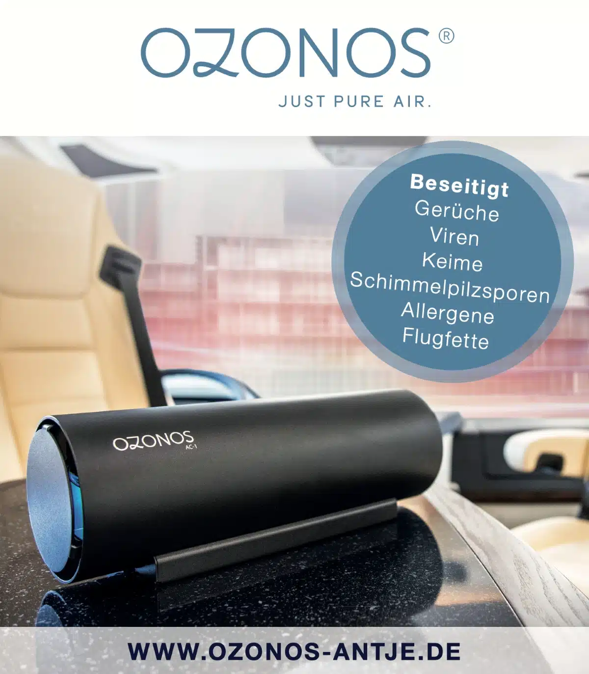 Der sehr leise Luftreiniger Ozonos AC-2 fokussiert vielfältige Problemfelder und eliminiert gerade (Koch-)Gerüche im Wohnmobil super effektiv. Zurück bleibt ein angenehm frischer Duft. Übrigens: Der OZONOS eliminiert auch sämtliche Allergene, was ein Geschenk für Allergiker und Asthmatiker ist.