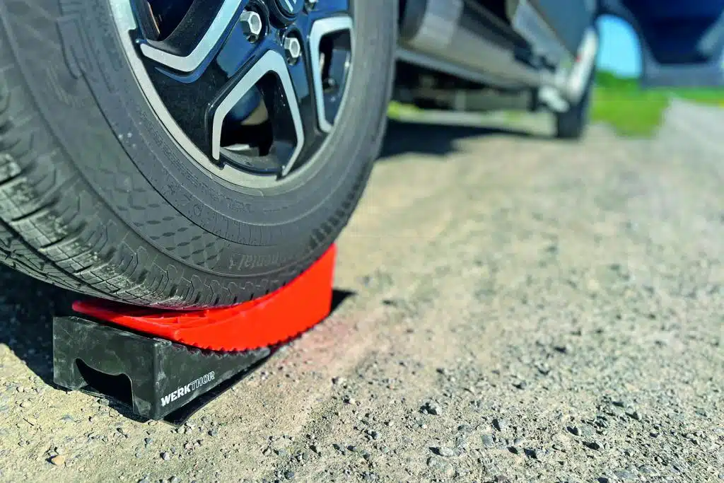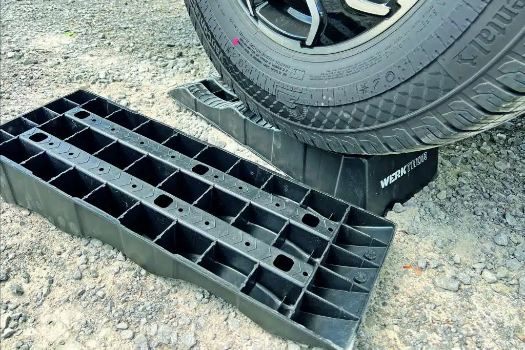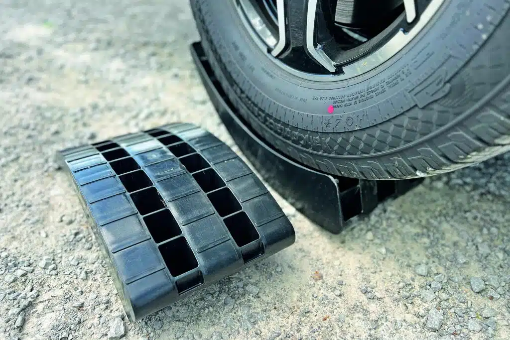 Kompakt, vergleichsweise leicht und doch enorm tragfähig. Das Nivellieren mit den Werkthor Stufenkeilen gelingt super einfach. Die mitgelieferte Unterlegmatte hält den Keil zudem optimal in Position, sodass er nicht verdreht. Einmal aufgefahren, steckt man den schwarzen Parkkeil unter den Rundkeil (gute Eingriffmulde verwenden, um Finger nicht einzuklemmen). Die runde Form hebt den Reifen (maximale Breite 180/190 Millimeter, Empfehlung der Redaktion) optimal schonend an, der Stopper hält die Parkposition. Eine clever Kombination. Realistisch hebt der Werkthor Rundkeil maximal 90 Millimeter. Sehr robuste Ausführung – die Schotter-Tortur absolviert der Werkthor ohne sichtbaren Verschleiß. Auf weichem Boden – konzeptbedingt – sinkt der Rundkeil gerne ein.