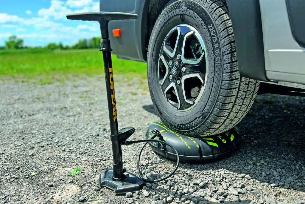 Flat-Jack mit den Ventilen zur Seite vor oder hinter den Reifen (bis zu 305er-Reifen möglich) legen, Camper mit Reifen mittig auf dem Kissen parken, Ventildeckel abschrauben, Ventiladapter aufstecken und arretieren, Kompressor starten. Wie von Geisterhand hebt sich der Camper auf Wunsch- oder Maximalhöhe, das sind bei der 2.0-Version 20 Zentimeter. Handbremse ziehen (wie bei allen anderen Ausgleichskeilen), fertig. Natürlich befüllt man die Flat-Jack-Luftkissen mit einem Mini-Kompressor an Bord, doch selbst eine Fahrradpumpe hebt mit minimaler Muskelkraft den Camper fix auf Wunschniveau. Auf scharfen Steinen oder grobem Schotter sollte Flat-Jack nur mit robusten Gummimatten unterfüttert zum Einsatz kommen. Der Flat-Jack kann auch als Hebekissen beim Montieren von Zubehör am Camper zum Einsatz kommen. Leer passt er als flache Scheibe in jede Lücke im Staufach. Den Flat-Jack mit 6 Zentimetern Hub gibt es für 119 Euro.