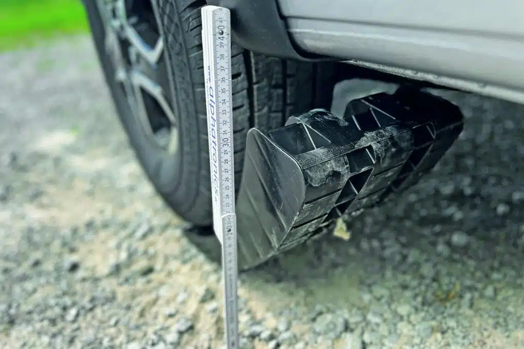 Man fährt mehr in den Keil hinein, als auf ihn drauf. Das gelingt super einfach, garantiert stufenloses Nivellieren – und am Ende steht der Reifen auf dem Froli Rundkeil Pro perfekt unterstützt. Wer beim Auffahren einmal zu weit fährt – kein Problem, der Keil dreht unter dem Reifen einfach durch. Wichtig bei Rundkeilen: Da man sie quasi vor dem Auffahren an den Reifen anstellt, muss ein Freiraum zur Schürze/Schweller gegeben sein. Beim Rundkeil Pro gibt Froli 28 Zentimeter an (Boden zu Schürze). Den Schottertest absolviert der Froli ohne sichtbare Macken, eine Unterlegmatte wäre dennoch sinnvoll. Auf einer weichen Wiese oder im Sand sinkt der Rundkeil deutlich ein. Hier hilft zur Not eine Hartholzplatte. Froli bietet für 32 Euro die Rundkeile Mini an, er nivelliert maximal 8 Zentimeter.