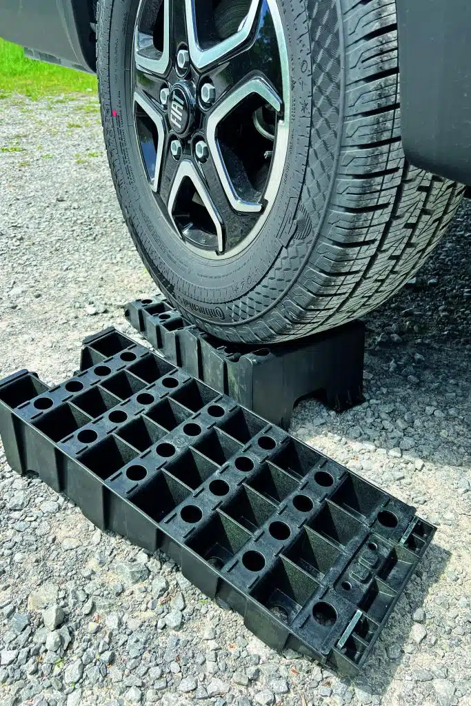 Die leichten Level Ups aus stabilem Polyäthylen HD (sollen UV-stabil sein) schultern laut Fiamma 2,5 Tonnen pro Keil – ein aufgeprägtes TÜV-Siegel untermauert dieses Versprechen. Die Prägung ist vorbildlich – andere Hersteller haben dies nicht. Mit fast 20 Zentimetern Breite eignen sich die Fiammas auch für breitere Reifen, das Auffahren gelingt, wie bei Stufenkeilen üblich, minimal schwieriger als bei Schrägkeilen, die recht flach gestalteten Rampen machen es dem Fahrer aber leicht. Die maximale Ausgleichshöhe sind 10 Zentimeter, der oben an der Kante sitzende Steg signalisiert dem Fahrer „Stopp“. Insgesamt machen die Level Ups einen guten Job, auf Schotter leiden die Stege der offenen Wabenstruktur aber schon nach wenigen Auffahrten sichtlich. Kleine Parkstopper (Chock-Level-Blockierhilfen) bietet Fiamma für 11 Euro, kleine Anti-Slip-Auffahrhilfen für 6 Euro an.