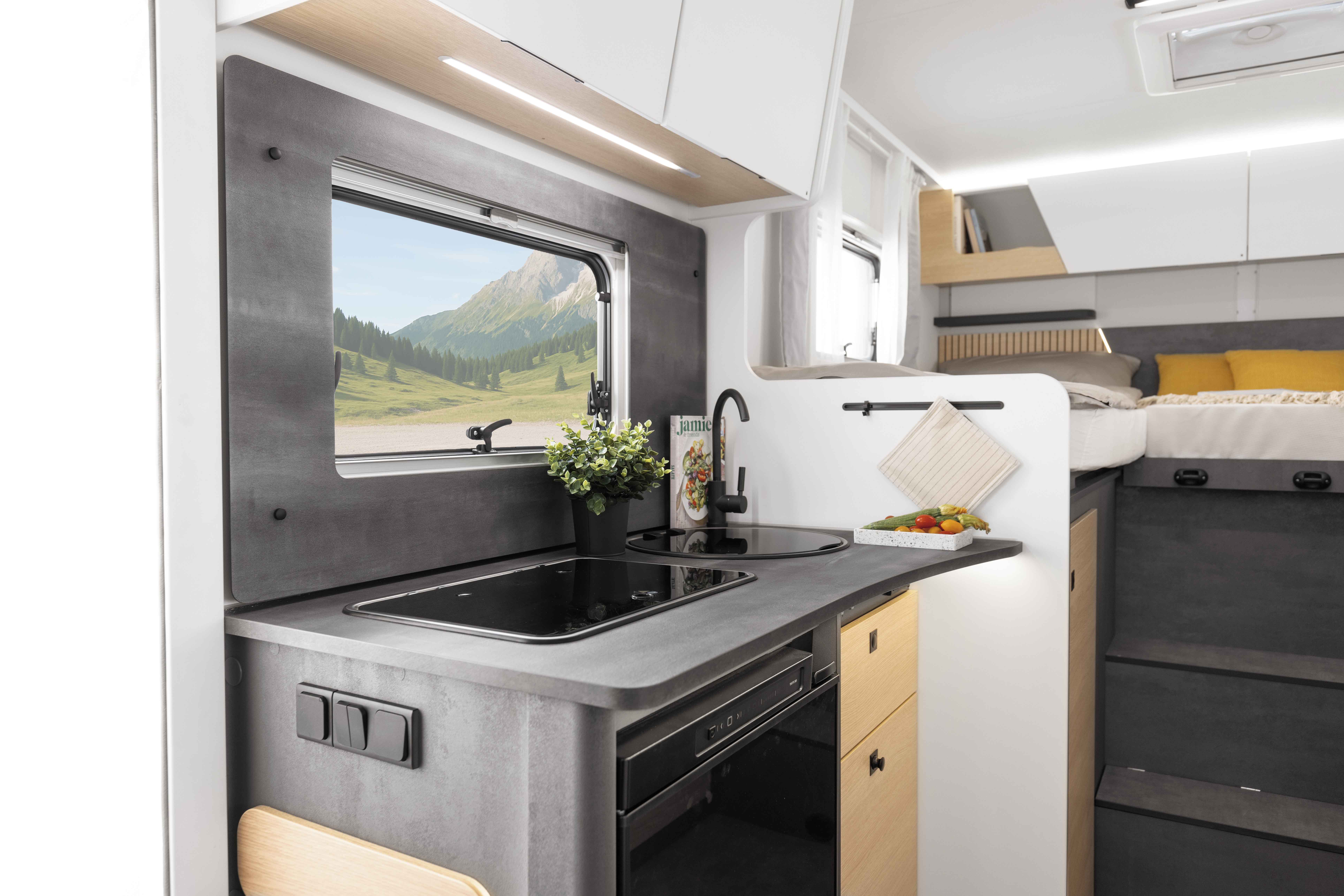 Der teilintegrierte Ahorn Camp T 690 überzeugt mit zwei komfortablen Einzelbetten im Heck und einer durchdachten Raumaufteilung, die viel Bewegungsfreiheit schafft. Der großzügige Wohnbereich mit gemütlicher Dinette, voll ausgestatteter Küche und praktischem Bad macht jede Reise entspannt und unabhängig. Zahlreiche Stauraumlösungen bieten Platz für Ausrüstung und Gepäck. Für noch mehr Schlafkomfort lässt sich der T 690 mit einem optionalen Dinettenbett und einem elektrischen Hubbett über der Dinette erweitern.