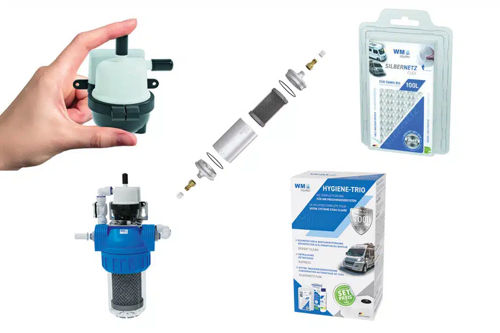 Den Anspruch auf sauberes Wasser auf Reisen setzt WM aquatec mit vier Produkten um, die aufeinander abgestimmt sind. Das sind 1. der WM Filter zum Befüllen, 2. das Silbernetz, 3. der UV-Filter ohne oder mit Aktivkohle-Patrone und 4. das Pflegeset für Tank und Leitungen.