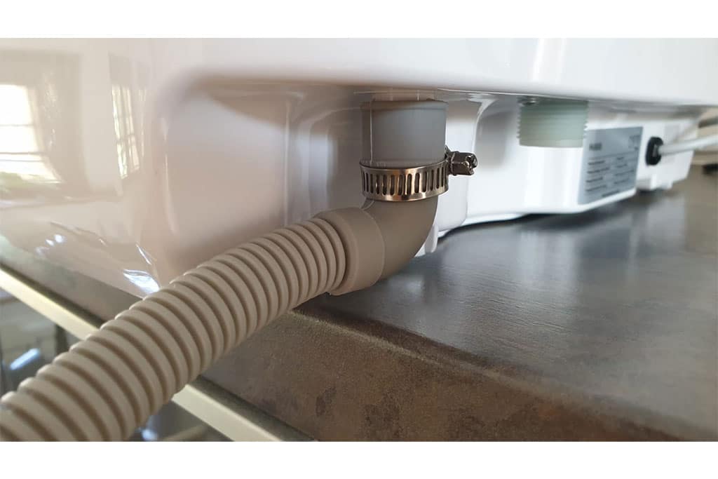 Der Schlauch wird auf der Rückseite des Mini-Geschirrspülers angebracht. Mit einem Schraubenzieher sollte die Schraube festgezogen werden, um auszuschließen, dass sich der Schlauch vom Geschirrspüler löst.