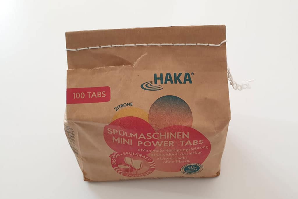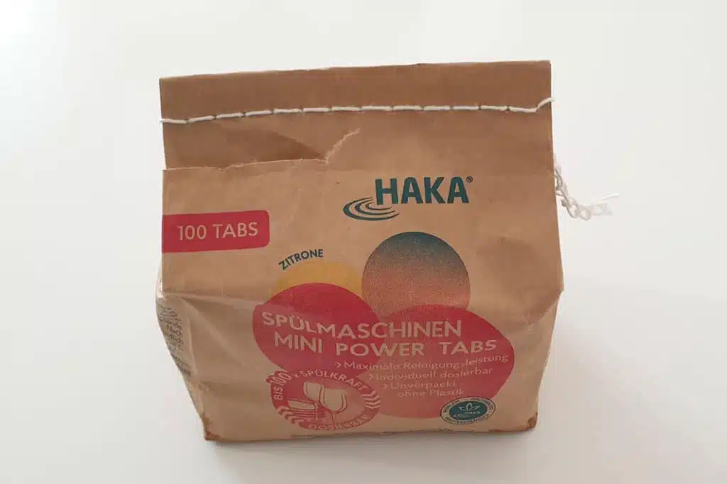 Die Redaktion verwendet im Test die Spülmaschinen Mini Power Tabs von HAKA. Die Tabs haben weder eine Folierung noch eine zusätzliche Verpackung. Die Umverpackung besteht zu 100 Prozent aus Papier.