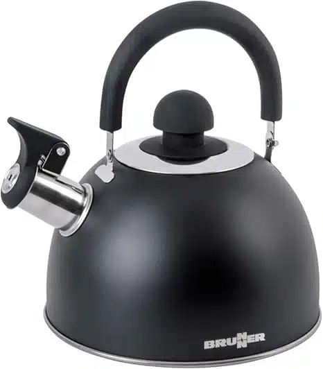Der Flötenkessel Dayo Black NG von Brunner wird vom Testteam durchgängig sehr gut bewertet. Er gefällt im schwarzen, edlen Design. Der Griff ist hochwertig verarbeitet. Er ist rutschfest, gummiert und zum einfachen Verstauen klappbar. Die Einfüllöffnung ist groß und der Deckel mit rundlichem Knauf gut greifbar. Einen Pluspunkt bekommt der Dayo Black zusätzlich für seinen induktionsgeeigneten Topfboden. So kann er auf Reisen auf unterschiedlichen Herdplatten genutzt werden. Der Edelstahl-Kessel kostet 30,66 Euro und ist unser Testsieger.