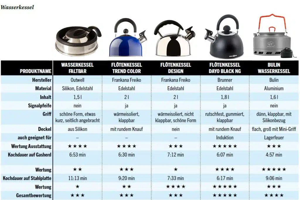 Das Testteam wollte checken, wie lange es dauert, bis das Wasser in den Kesseln kocht. Um aussagekräftige Ergebnisse zu bekommen, füllte es in jeden Kessel ein Liter Wasser. Nacheinander wurden die Fünf auf dem Gasherd eines Wohnmobils platziert und ein Liter Wasser erhitzt. Die Zeit bis zum Kochen beziehungsweise Ertönen der Pfeife wurde jeweils mit der Stoppuhr festgehalten. Verblüffend: Vier Kessel brauchen zwischen sechs und sieben Minuten. Nur der Bulin-Kessel aus Aluminium ist schneller und hebt sich mit einer Zeit von knapp fünf Minuten von seinen Konkurrenten ab. Sein Boden ist mit einem Wärmespeicher ausgestattet, um den thermischen Wirkungsgrad der Gasflamme zu verbessern. Zugegeben, mit einem elektrischen Wasserkocher geht das Kochen noch schneller – nach vier Minuten kocht das Wasser. Doch wie sagt man so schön: Abwarten … und Tee trinken.