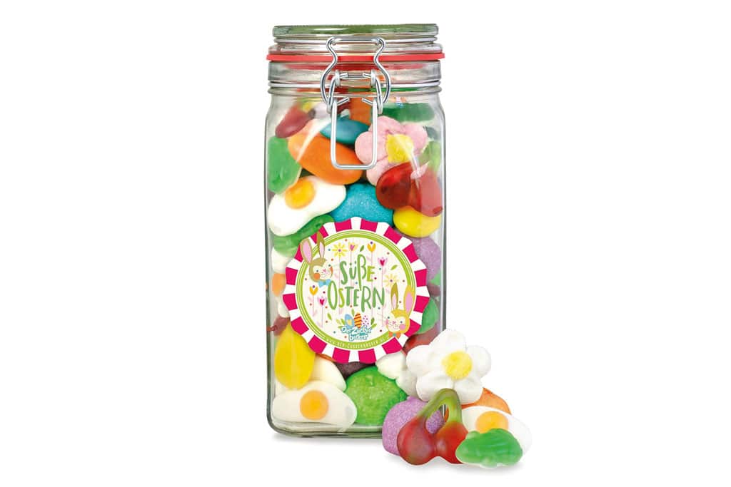 Mit der Fruchtgummi & Schaumzucker-Mischung von Der Zuckerbäcker können Sie süße Ostergrüße an Ihre Lieben verschenken. Die bunte Mischung aus fruchtigen Gummibärchen und fluffigem Schaumzucker ist perfekt für Naschkatzen und kommt in einem nostalgischen Bügelglas, welches Sie auch nach Ostern gut weiterverwenden können.
