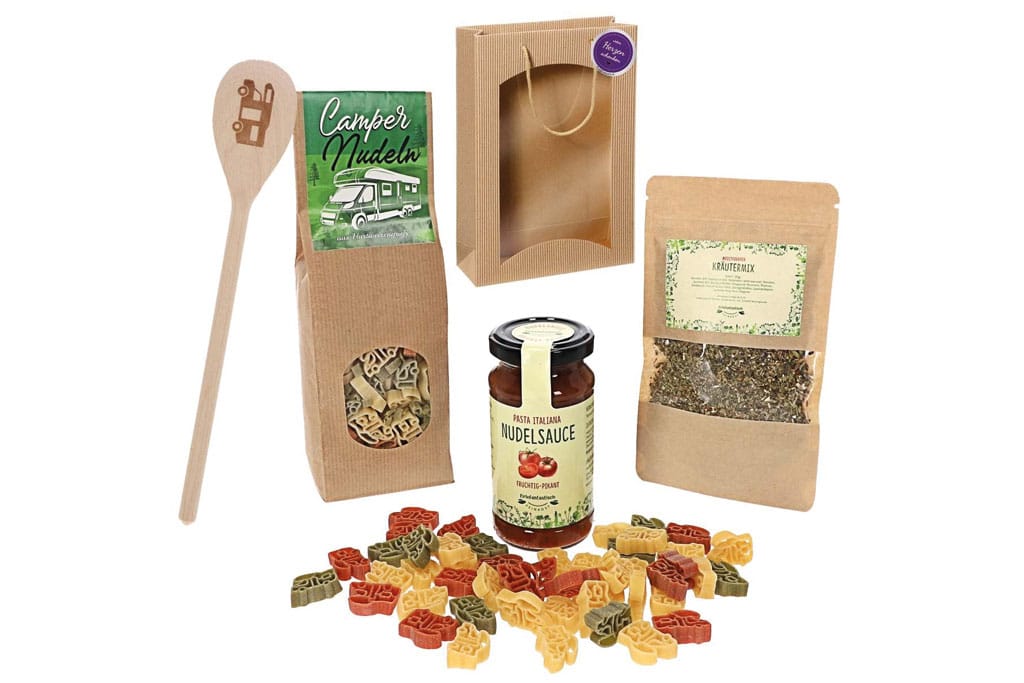 Dieses Feinkost-Geschenkset für Wohnmobilisten von Firlefantastisch Der Partyshop bringt mediterranen Geschmack direkt in die Campingküche. Die Nudeln in origineller Wohnmobilform machen gute Laune beim Kochen, während die klassische Tomatensauce und die mediterranen Kräuter für authentisches Aroma sorgen. Der gravierte Kochlöffel aus Holz ergänzt das Set. Verpackt in einer dekorativen Tragetasche mit Sichtfenster ist es ein ideales Geschenk für Wohnmobil-Fans und Reisende. Das Set kostet 21,99 €.