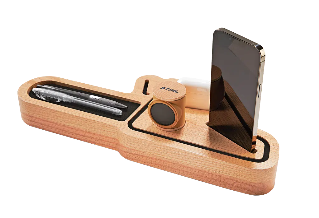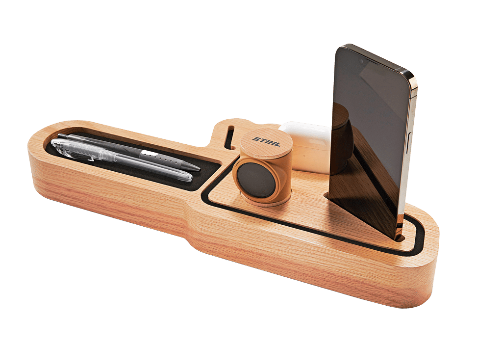 Die Ladestation Organiser Icon von Stihl bietet eine praktische und zugleich schicke Möglichkeit, mehrere Geräte wie Handy, Smartwatch und Kopfhörer zu laden und dabei Ordnung zu halten.