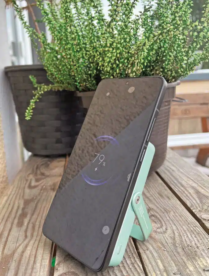 Die Charge ’n’ Go Powerbank bietet zwei Möglichkeiten zum Laden von Smartphones und Co: magnetisch und kabellos und über die bi-direktionale USB-C-Schnittstelle, über die die Powerbank auch selbst geladen wird. Ihr Ladestand wird über eine Ladeanzeige mit fünf LEDs angezeigt. Die Powerbank ist Mag-safe kompatibel, iPhones haften nahtlos und sicher an ihr, der Magnet ist allerdings nicht so stark, um zu verhindern, dass das iPhone in einer Jackentasche oder einem Rucksack nicht doch mal den Kontakt verliert. Ein iPhone 13 mit 3.227 mAh starkem Akku hat die Charge ’n’ Go per kabellosem Laden in einer Stunde und 50 Minuten von 15 auf 100 Prozent geladen. Fürs Camping ist die Powerbank bedingt geeignet: Im Fahrzeug eignet sie sich hervorragend, um sie während des Ladevorgangs mit ihrem Ständer hinzustellen und den Smartphone-Bildschirm währenddessen freihändig sowohl im Hoch- als auch Querformat betrachten zu können. Besonders robust ist sie hingegen nicht: Bereits nach einem Sturz hatte das Glas der Powerbank einen ersten kleinen Riss, ein weiteres Anschlagen führte zu zahlreichen Rissen und abgesplitterten Ecken über die gesamte Glasfläche hinweg. Zudem ist der USB-C-Anschluss nicht vor eintretender Feuchtigkeit geschützt.