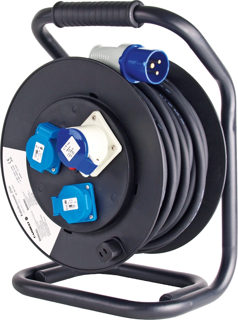 Für faire 119 Euro bietet Carbest seine CEE-Trommel (Art.-Nr.: 82027) an. Mit 7,8 Kilogramm ist sie das Schwergewicht im Vergleich, der robuste Rahmen aber kaum größer als bei anderen Trommeln. Über die CEE-Dose und ein nötiges, optionales Adapterkabel wird die Trommel mit dem Fahrzeug verbunden – zwei Schuko-Dosen erlauben den Betrieb von 230-Volt-Verbrauchern vor dem Camper (Licht, Grill, Kocher). Ab- und Aufwickeln gelingt easy, etwas komfortabler wäre es noch, wenn der Drehknopf rund und nicht eckig wäre. Wie alle anderen Hersteller (bis auf Kalle) setzt Carbest auf ein normkonformes 25 Meter langes H07-RN-F-3-Kabel, wie AS-Schwabe allerdings auf eine schwarze Ummantelung – für den Einsatz auf dem Campingplatz nicht ganz optimal.