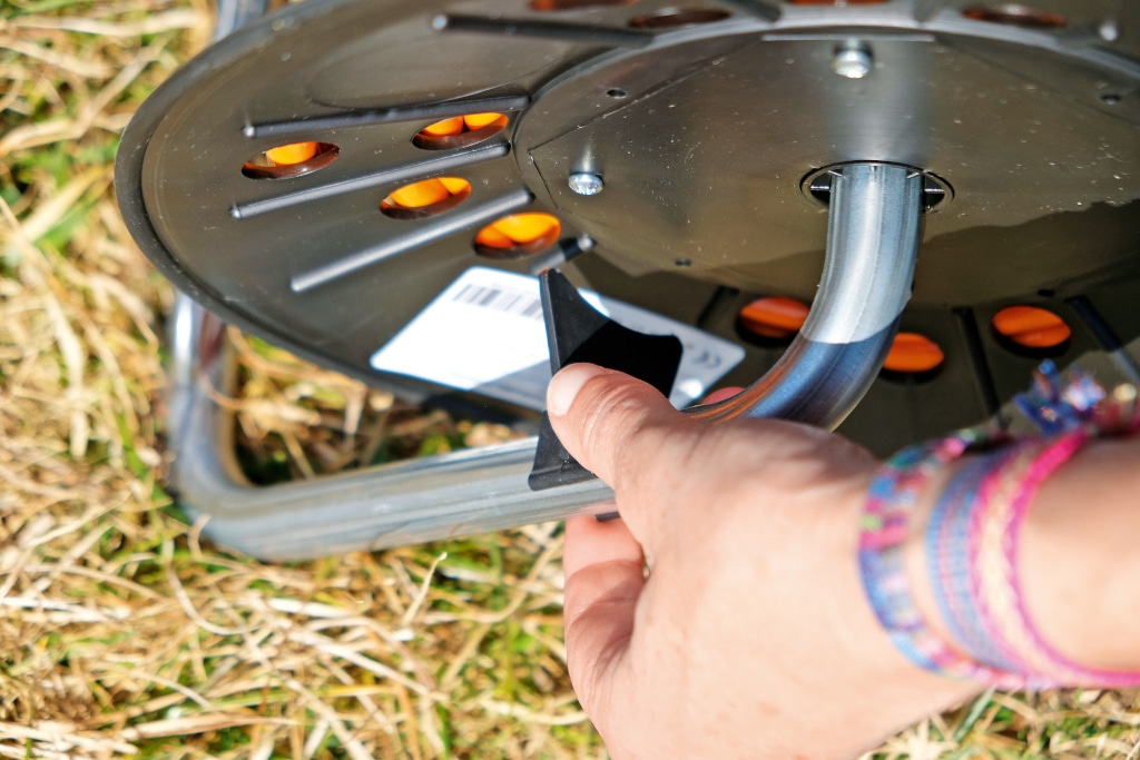 Ein Kabeltritt zum leichteren Fixieren der Trommel mit dem Fuß beim Aufrollen kostet 8,50 Euro. Er empfiehlt sich für Camper, die beim Aufwickeln das Hin- und Herkippen der Trommel, auch im sandigen Untergrund, verhindern wollen.