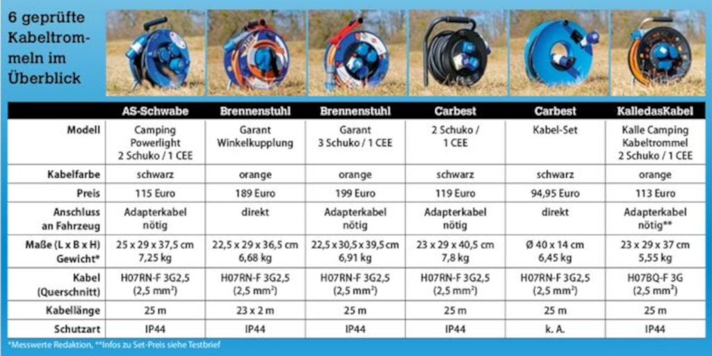 Parallel zum Standard CEE gilt: Bei einem Stromnetz von maximal 16 Ampere müssen alle Kabel einen Mindestquerschnitt von 2,5 Quadratmillimeter aufweisen. Da kaum jemand permanent ein loses 25-Meter-Kabel im Fahrzeug bändigen möchte, gehen in nahezu allen Vans Kabeltrommeln mit auf die Reise. Insgesamt hat das Testteam von CamperVans sechs Kabeltrommeln verglichen. Eine von AS-Schwabe, zwei von Brennenstuhl, zwei von der Reimo-Eigenmarke Carbest und eine von KalledasKabel. Zwei davon können direkt an Fahrzeug und Stromsäule eingesteckt werden, vier Sets benötigen für den Anschluss am Fahrzeug ein Adapterkabel.