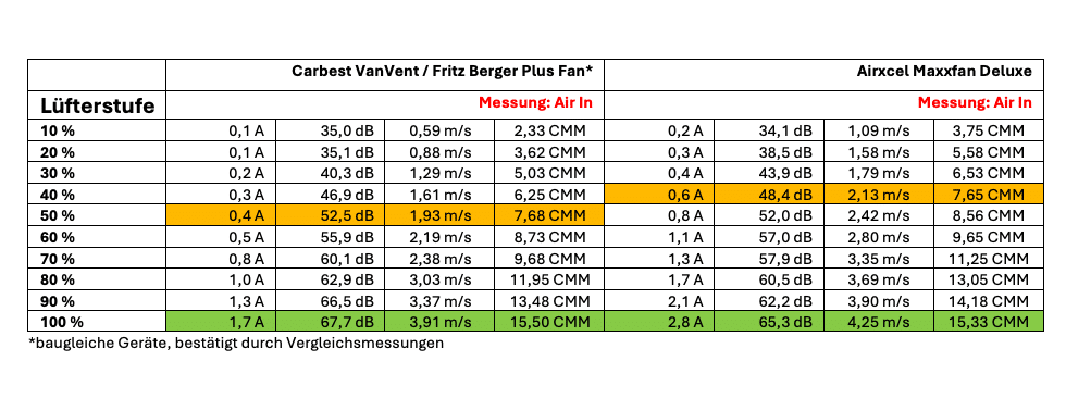 Schon 2020 zeigte sich: Große Luftmengen bewegen können alle Ventilationsdachhauben mehr oder weniger überzeugend. Das gilt auch für den aktuellen Vergleich der Maxxfan mit der Carbest VanVent und der Fritz Berger Plus Fan. Da die Leistung der Lüfterstufen von Ventilationsdachhauben immer im direkten Zusammenhang mit dem Stromverbrauch und der Lautstärke betrachtet werden muss, um eine sinnvolle Vergleichbarkeit herzustellen, haben wir Ihnen diese Ergebnisse in zwei Tabellen übersichtlich dargestellt.