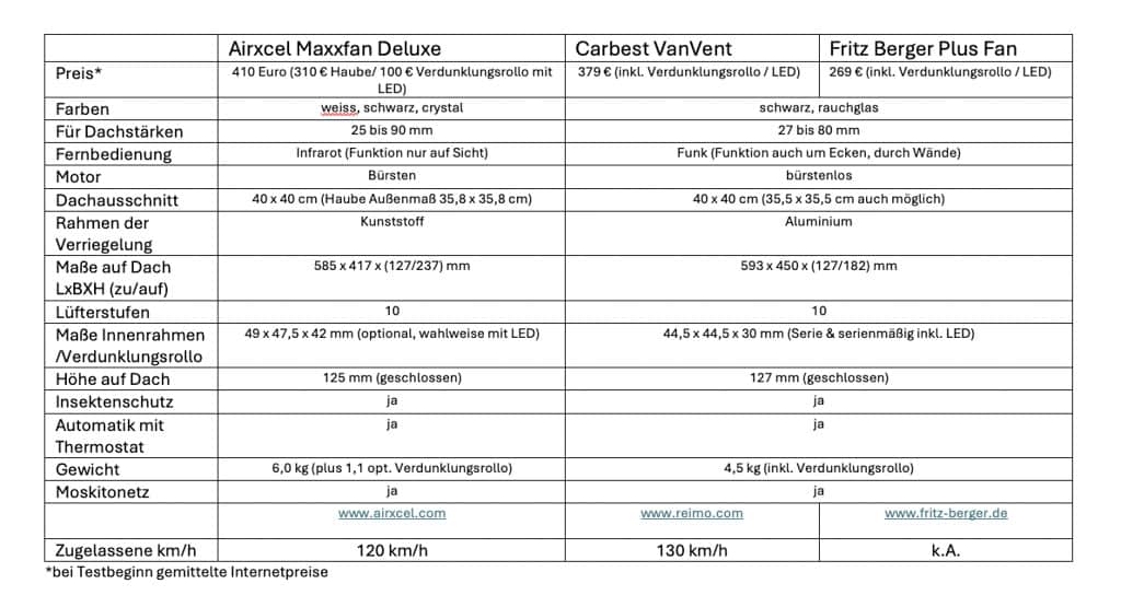 2022 holt sich die Ventilationsdachhaube Maxxfan Deluxe den verdienten Testsieg. Neue Herausforderer wackeln am Thron des Bestsellers. Und das mit überzeugendem Erfolg. Die Carbest VanVent und die Plus Fan von Fritz Berger beweisen sich im Vergleichstest der Ventilationsdachhauben für Wohnmobile.
