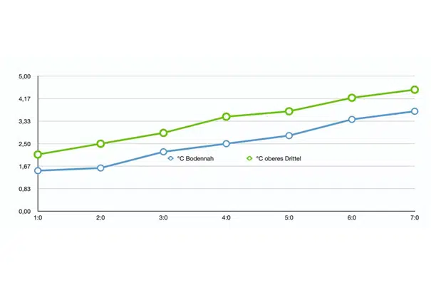 So haben wir mit 3 Temperatursensoren im Innern der Box – knapp über dem Boden, in der Mitte und knapp unter dem Deckel – die Temperatur erfasst. Im Testverlauf öffnen wir morgens, mittags und abends einmal kurz den Deckel für 10 Sekunden – so wie im Reisealltag, wenn zum Frühstück, Mittag- und Abendessen etwas benötigt wird. Ein Datenlogger zeichnet den Temperaturverlauf auf.