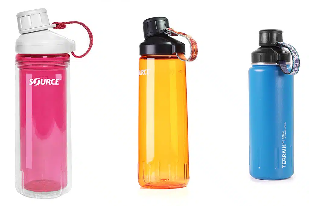 Ob beim Fahrradfahren, Wandern oder Stadtbummel – vor allem im Sommer ist eine gute Trinkflasche ein Muss. Die Firma Source hat gleich drei verschiedene Modellreihen entwickelt, die sich alle durch ihren praktischen und einfach zu bedienenden Clickseal-Verschluss auszeichnen. Zum Trinken dreht der Nutzer die Verschlusskappe minimal auf und zieht sie nach oben, zum Verschließen drückt er einfach wieder leicht auf den Deckel – das „Klick-Geräusch“ garantiert, dass die Flasche jetzt auslaufsicher verschlossen ist. Die Modelle der Eco-Clickseal-Reihe (Mitte) punkten mit doppelwandiger Konstruktion und halten Getränke besonders lange kühl beziehungsweise warm. Erhältlich sind sie mit 0,6 Litern Volumen (230 Gramm) für 39,90 Euro. Die Act-Clickseal-Reihe (links) verzichtet auf die doppelwandige Konstruktion, die Flaschen in zwei Größen (0,7 und 0,95 Liter) sind daher etwas leichter (150 und 180 Gramm) und vergleichsweise günstiger: 34,90 beziehungsweise 36,90 Euro. Wer maximale Kühlleistung und Robustheit sucht, wird bei der Terrain-Clickseal-Serie (rechts) fündig. Die Flaschen halten Getränke bis zu zwölf Stunden warm und 24 Stunden kalt und sind aus robustem Edelstahl gefertigt. Erhältlich mit einem Volumen von 0,7 Litern (390 Gramm) für 49,90 Euro.