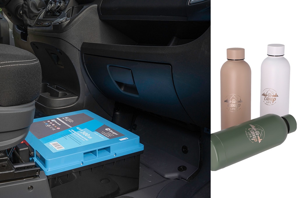 Mit einer Kapazität von 300 Amperestunden und einem Entladestrom von 250 Ampere ist die Berger LiFePO4 Lithium Untersitz Batterie Pro ein idealer Begleiter in Freizeitfahrzeugen. Mit 35 mal 35 mal 19 Zentimetern Größe (inklusive Griff) passt sie perfekt unter den Fahrer- oder Beifahrersitz, ausgestattet ist sie zudem mit Schutzklasse IP65, ihr Gewicht liegt bei lediglich 30,5 Kilogramm. Dank Bluetooth-Schnittstelle kann der Nutzer die Batterie jederzeit über sein Smartphone überwachen, eine integrierte Heizung verbessert die Leistung auch bei frostigen Temperaturen, bietet Schutz vor Schäden und verlängert die Lebensdauer. Die Heizfunktion aktiviert sich automatisch, wenn die Temperatur der Batterie während des Ladevorgangs unter Null Grad Celsius sinkt. Der Preis: 1.499 Euro. Außerdem neu im Fritz-Berger-Shop: Edelstahl-Trinkflaschen der Marke Camplife. Die kompakten, 500 Milliliter fassenden, doppelwandigen Edelstahl-Trinkflaschen halten Getränke lange warm oder kalt und passen mit einem Maß von 3,7/7,5 mal 22,5 Zentimeter (ØxH) in jeden Rucksack. Dabei wiegen sie lediglich 290 Gramm. Erhältlich in Beige, Olive, Schwarz und Weiß für 12,99 Euro.