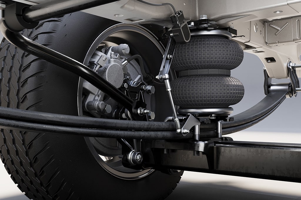 Dieses sensorgesteuerte Zusatzluftfedersystem von Goldschmitt wird ergänzend zur werkseitigen Hinterachsfederung montiert.