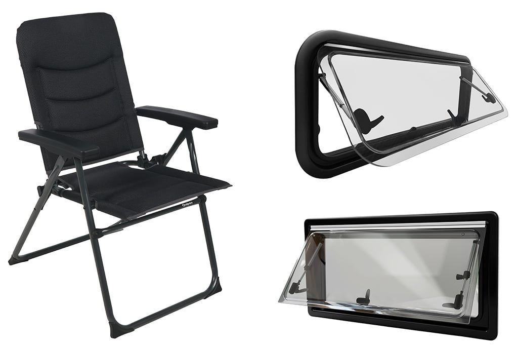 Im Movera-Sortiment gibt es 2026 unter der Eigenmarke Quipon einige neue Produkte, darunter der Klappstuhl Vaneo sowie die Seitenfenster View und Vision. Beim Vaneo-Klappstuhl handelt es sich um einen Rundrohstuhl mit leichtem und stabilem Aluminiumrahmen, atmungsaktivem 2D-Mesh-Stoff und dreifach verstellbarer Armlehne. Sein Packmaß beträgt lediglich 60 mal 82 mal 7,5 Zentimeter, seine Traglast 100, sein Gewicht vier Kilogramm. Sein Preis: 65,95 Euro. View ist ein klassisches Seitenfenster, das mit Doppel-Acrylverglasung und robustem Polyurethan-Rahmen eine hervorragende Isolierung und Wärmedämmung bietet. Verdunkelungsblende und Fliegengitter sind integriert, erhältlich ist es in vier Größen (500 mal 300, 500 mal 450, 700 mal 400 und 900 mal 550 Millimeter) ab 208,50 Euro. Vision ist ein gewölbtes Ausstellfenster für Kastenwagen mit abgerundeter Bauweise. Die Acrylverglasung ist dunkel getönt, der Aluminiumrahmen sorgt für ein niedriges Gewicht und eine Mehrfachverriegelung sorgt für maximalen Einbruchschutz. Zudem ist es stufenlos ausstellbar, passend für Wandstärken von 22 bis 43 Millimeter und integriert ein praktisches Rollosystem für Sichtschutz und Schatten. Erhältlich in fünf Größen (280 mal 380, 560 mal 465, 750 mal 465, 818 mal 315 und 960 mal 450 Millimeter) ab 275,50 Euro.