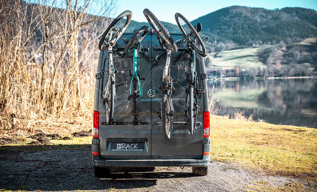 Mit dem PUSHrack Fahrradträger V3 stellt PUSH components die neueste Generation seines modularen Heckträgersystems für Kastenwagen vor. Ausgangspunkt des Fahrradträgers sind Airline-, Thule- oder Fiamma-Schienen, an denen der Camper den Träger montiert. Die Fahrräder werden anschließend am Lenker eingehängt, vertikal transportiert und offroad-tauglich gesichert. Das robuste System ermöglicht so den Transport von bis zu vier Fahrrädern mit einem Gesamtgewicht von 100 Kilogramm. Ein großer Pluspunkt des Systems: Die Bikes können einzeln entnommen werden. Außerdem lässt sich jedes Fahrrad separat am Träger gegen Diebstahl sichern. Der neu konzipierte Reifenhalter erlaubt es, unterschiedliche Fahrradtypen ohne Umbauten am Fahrrad selbst zu transportieren – vom Gravelbike bis zum Fatbike. Das es sich beim V3 um ein modulares System handelt, variiert der Preis je nach Zusammenstellung. Airlineschienen bietet PUSH components ab 200 Euro an, den Fahrradträger inklusive einem Lenker- und Reifenhalter und Zubehör in Form von Schrauben, Sperrriegel und Sicherungsseil gibt es ab 180 Euro. Außerdem bietet PUSH components in seinem PUSHrack-System weitere Module wie einen E-Scooter Träger, eine Aufnahme für Kinderfahrradanhänger, einen Gepäckträger-Adapter und vieles mehr an.