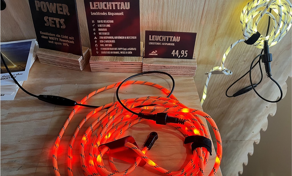 Hersteller The Sunnyside bietet praktisches camping-Zubehör und nützliche Gadgets vor allem aus dem Bereich Beleuchtung. Neu ist die Campingleuchte Floppy, eine kleine Laterne aus Soft-Silikon. Sie ist absolut bruchsicher, wetterfest, von schummrigem Ambientelicht bis sehr hellem Leselicht dimmbar und lässt sich flexibel befestigen. Sie hat einen Standfuß, mit dem der Camper sie auf einem Tisch platzieren kann, an einen Ast hängen oder um einen Markisenfuß wickeln kann. Der eingebaute Akku hält zwischen vier und 14 Stunden und wird per USB-C-Anschluss geladen. Erhältlich ist die Floppy in Rot, Orange, Gelb, Grün, Grau und Blau für 39 Euro. Praktisch auch: Leuchtende Abspannseile. Die Leuchttaue von The Sunnyside sind sechs Meter lang, bis 150 Kilogramm belastbar und zum Abspannen, Aufhängen und Befestigen geeignet. Erhältlich in Orange, Weiß und Grün für 44,95 Euro.