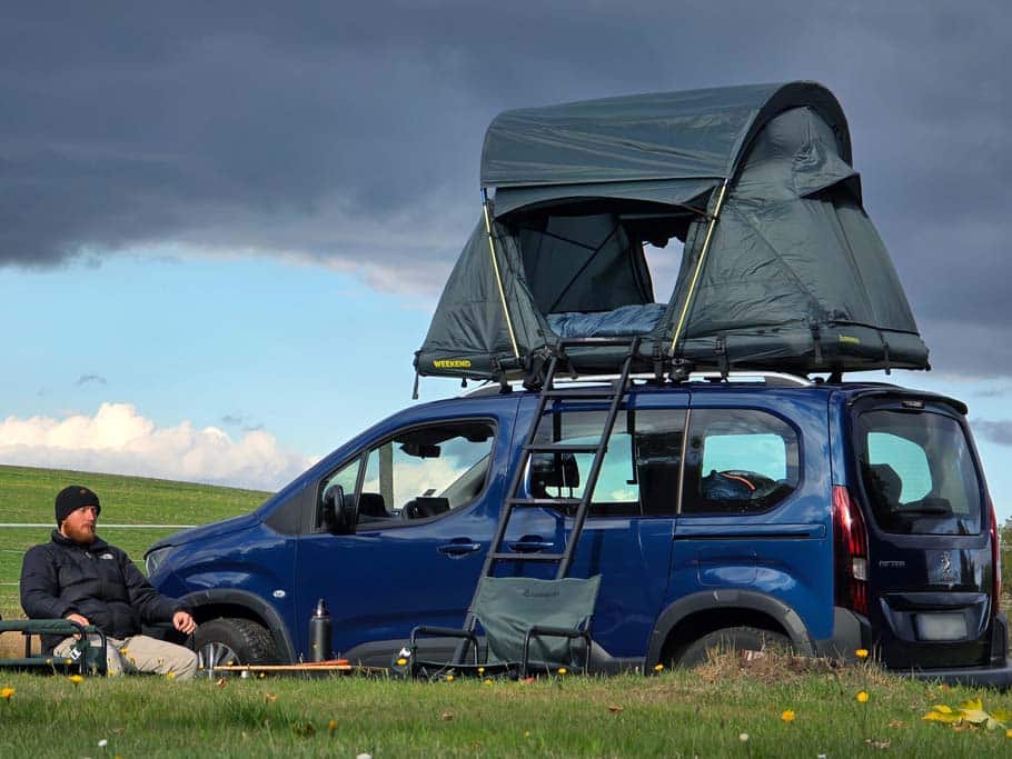 Wer ein Dachzelt hat, braucht eine Garage zur Lagerung sowie viel Muskelkraft und jede Menge Werkzeug zur Montage? Nicht so bei Groenberg. Mit dem Weekend stellt der dänische Hersteller das nach eigenen Angaben weltweit leichteste und kompakteste Dachzelt im Taschenformat für zwei Personen vor. Das Weekend hat keinen festen Unterbau, der Boden wird mit einer mitgelieferten Doppelhubpumpe aufgepumpt. Den Zeltstoff stabilisieren zwei leichte und zusammensteckbare Aluminium-Rundbögen. Das Zelt wiegt in der Classic-Ausführung nur rund zwölf, in der Comfort-Variante rund 14 Kilogramm und kann so problemlos von einer Person alleine aufs Autodach gesetzt werden. Wird das Weekend nicht benötigt, lässt es sich einfach in seiner Stautasche zusammenfalten (Packmaß: 75 mal 48 mal 40 Zentimeter) und beispielsweise am Boden eines Kleiderschranks aufbewahren. Für die Weiterfahrt zum nächsten Stellplatz muss das Weekend vom Dach abgenommen und verstaut werden – so hat der Camper aber immerhin nicht mit störenden Windgeräuschen oder Beschränkungen bei der Höchstgeschwindigkeit zu kämpfen. Belüftungsöffnungen vorne und hinten, kleine Stautaschen im Innern sowie Schlaufen, um Zubehör aufzuhängen, sorgen für zusätzlichen Komfort. Im Preis von 999,95 Euro (Comfort: 1.199,95 Euro) ist zudem eine ausziehbare Teleskopleiter enthalten. www.groenberg.com