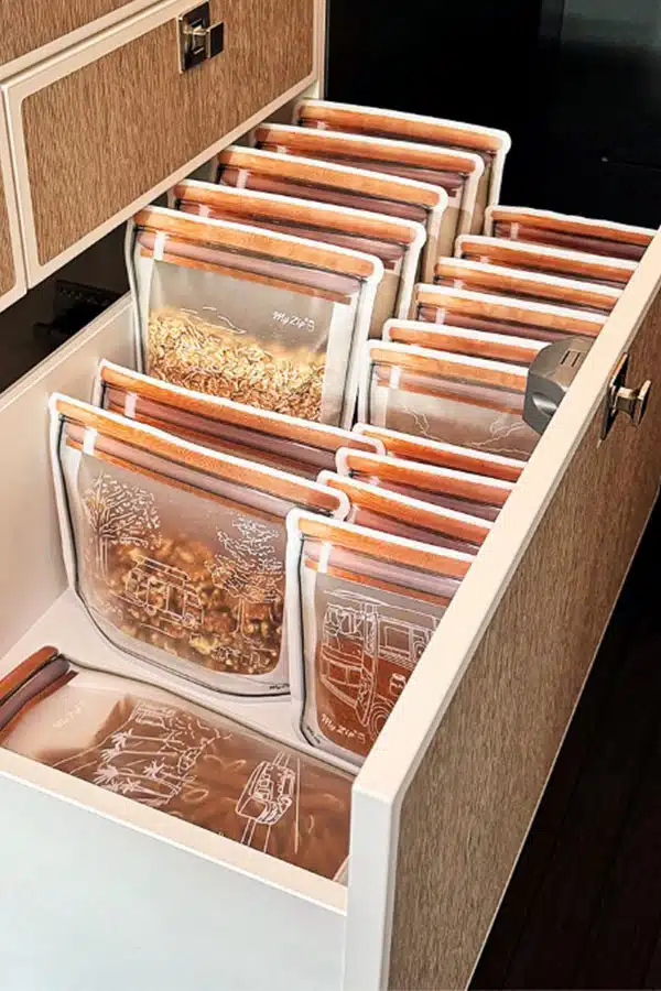 Haferflocken, Mehl und Zucker, Nüsse, Rosinen oder Sonnenblumenkerne: Für eine ausgewogene und abwechslungsreiche Ernährung nehmen Camper auch gerne viele verschiedene Zutaten mit auf ihre Touren. Vor allem für kürzere Touren müssen sie aber nicht in rauen Mengen an Bord sein. Neu im Frankana-Sortiment und eine praktische und vor allem platzsparende Alternative zu Originalverpackungen oder Vorratsgläsern sind die MyZip-Beutel. Dabei handelt es sich um wiederverschließbare Plastikbeutel in verschiedenen Größen, die sich leicht befüllen lassen und anschließend platzsparend nebeneinander in Oberschränken oder Schubladen mit auf Reisen gehen. Top: Die Beutel schützen vor Feuchtigkeit und sind zudem luftdicht sowie für Kühlschrank, Gefrierfach, Mikrowelle und Spülmaschine geeignet.