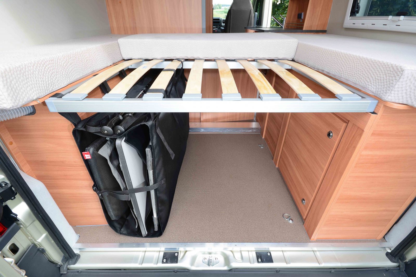 Die Zoombox von Des-Tec bringt Ordnung ins Heck von Kastenwagen: Die große Stauraumbox wird unterm Bett befestigt und bietet jede Menge Platz für Campingmöbel und anderen Kram.