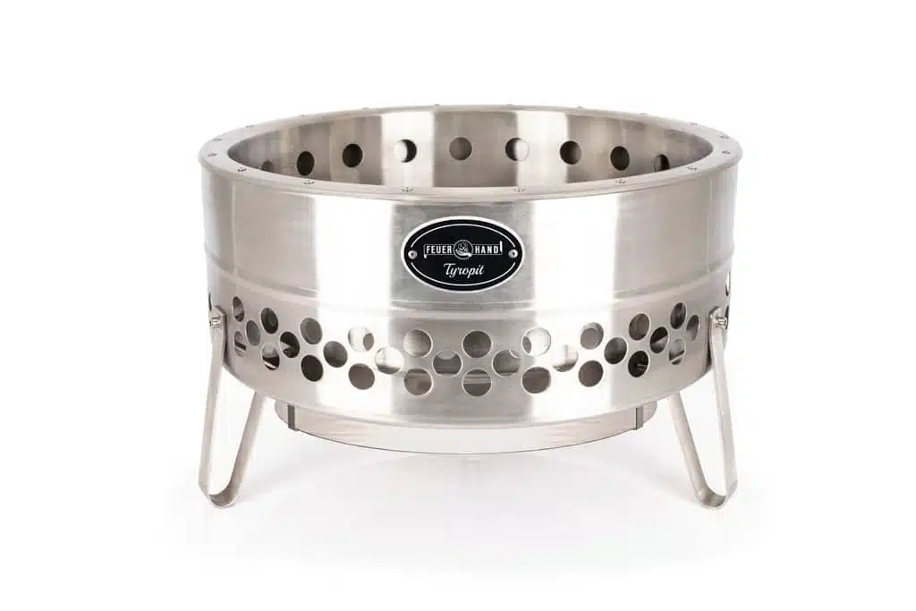 Der Tyropit ist doppelwandig aus Edelstahl gefertigt, wodurch es im Brennraum zu optimaler Sauerstoffversorgung kommt. Die herausnehmbare Ascheschale mit Funkendom minimiert den Funkenflug und ist einfach zu reinigen. Ein Hitzeschild am Boden schirmt den Untergrund zusätzlich vor hohen Temperaturen ab. Aufgebaut misst der Tyropit 62,3 (Durchmesser) mal 34,9 Zentimeter (Höhe) und wiegt 11,5 Kilogramm. Der Preis: 299,99 Euro.