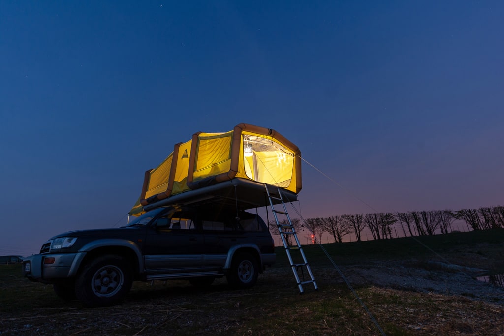 Gentle Tent präsentiert mit dem Sky Loft das nach eigenen Angaben größte Dachzelt der Welt. Das aufblasbare Zelt mit knapp zehn Kubikmetern Raumvolumen bietet eine Liegefläche von 3,4 mal 2,0 und eine Innenraumhöhe von 1,4 Meter.