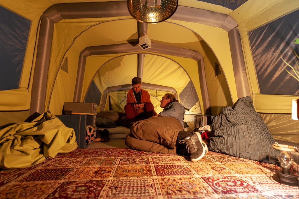 Gleichzeitig beträgt das Packmaß kompakte 165 mal 145 mal 15 Zentimeter, das Gewicht liegt bei schlanken 49 Kilogramm. Das Sky Loft besteht aus mehreren Luftkammern, die mithilfe einer elektrischen Pumpe in rund zehn Minuten aufgeblasen werden. Dank seiner Größe lässt sich der Innenraum in zwei Zimmer aufteilen. Während der vordere Teil als Schlafzimmer dient, bietet der hintere Teil einen licht- und sonnendurchfluteten Raum, der den Blick auf die Sterne freigibt. Insgesamt kommen im Sky Loft bis zu fünf Personen unter. Das Zelt lässt sich sowohl längs als auch quer zum Fahrzeug montieren und so flexibel einsetzen. Auch die Montage auf einem Anhänger ist möglich. Das Sky Loft ist ab Dezember für 3.390 Euro erhältlich.