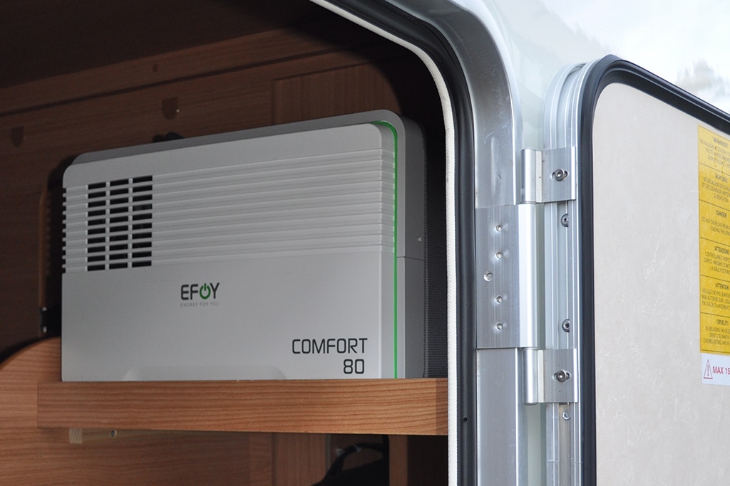 So funktioniert’s: In der Heckgarage, unter der Sitzbank oder im Seitenfach verbaut, ist die EFOY Brennstoffzelle fest mit der Batterie verbunden und überwacht kontinuierlich deren Ladezustand. Sinkt der unter eine voreingestellte Schwelle, schaltet sich die Brennstoffzelle vollautomatisch ein und lädt die Batterie wieder auf. Ist die Batterie voll, wechselt die Brennstoffzelle ebenso automatisch zurück in den Standby-Modus. Dabei ist sie umweltfreundlich und leise: Im Betrieb produziert sie neben Strom lediglich Abwärme, Wasserdampf mit etwas Kohlendioxid und ein leises Summen.