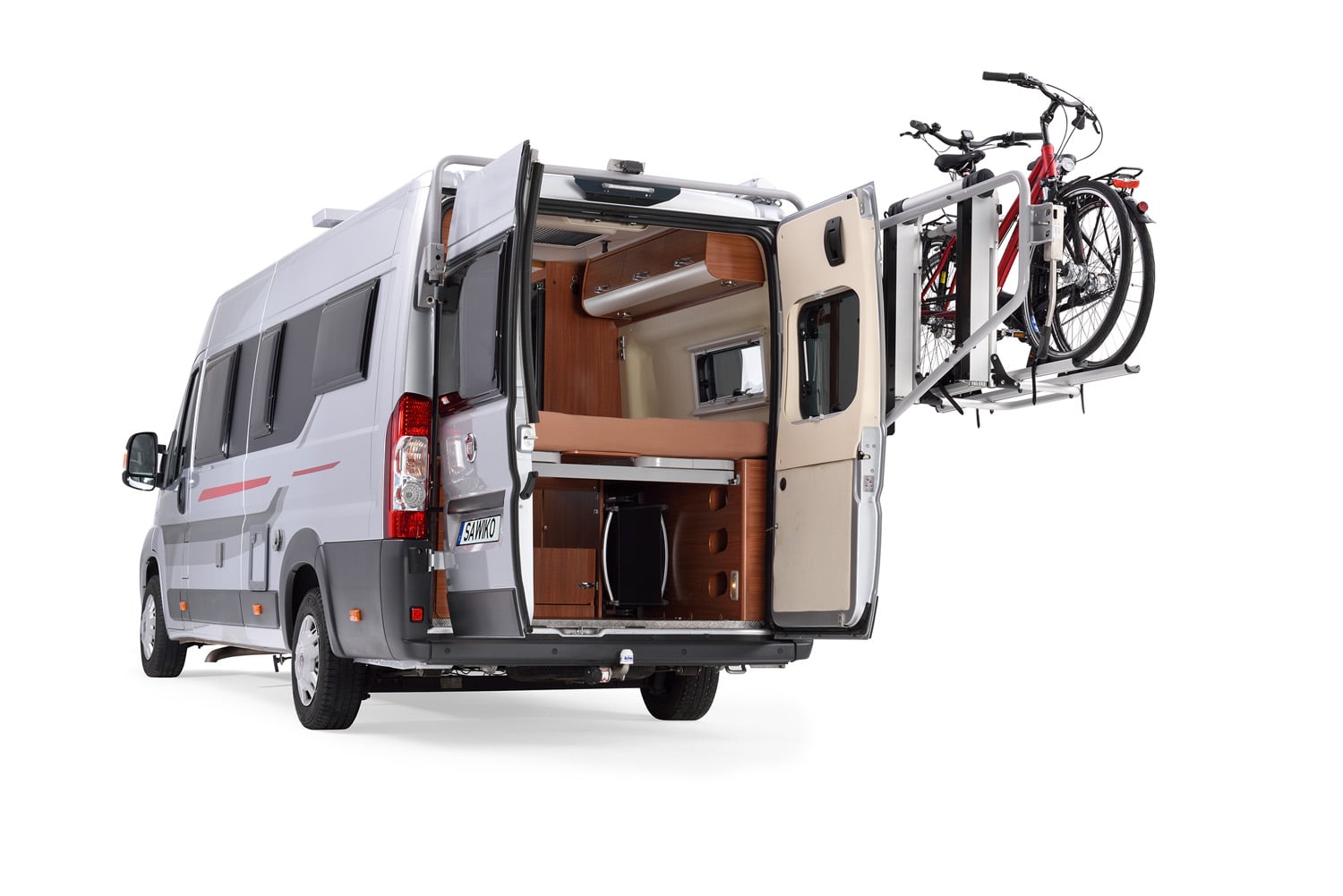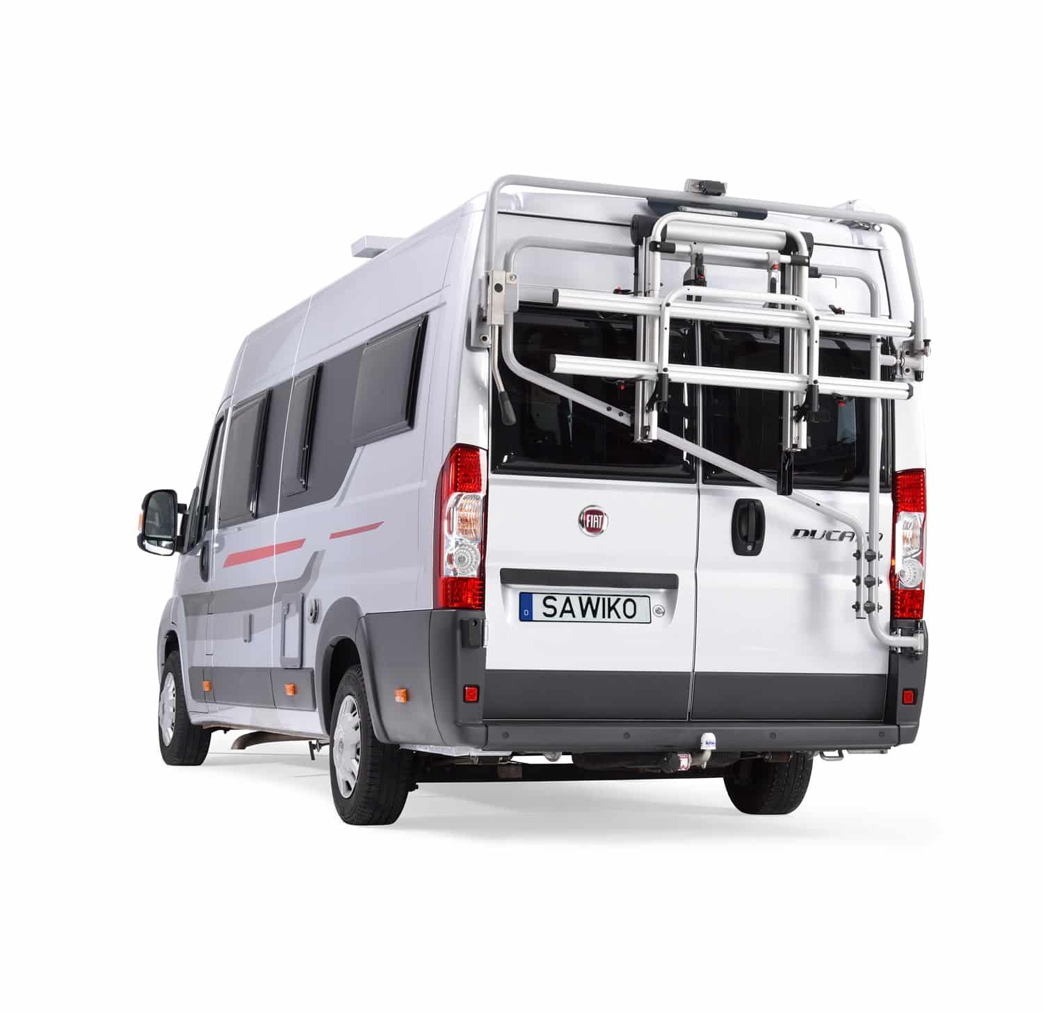 Auf dem neuen Heckträger Vario 150 von Sawiko lassen sich Fahrräder, E-Bikes und Roller gleichermaßen transportieren. Der Vario 150 ist größtenteils aus Aluminium gefertigt und wiegt lediglich 29 Kilogramm (ohne Rüstsatz). Dabei hat er eine Nutzlast von 150 Kilogramm. Wird er nicht benötigt, lässt er sich einfach per Hebel am Leuchtenträger hochklappen. Preis: 1.299 Euro. Weiterentwickelt hat Sawiko den bewährten Futuro. Den Heckträger gibt es künftig auch mit 12-Volt-Motor, um ihn elektrisch bis zu 110 Zentimeter abzusenken. Im Fall einer Störung lässt er sich weiterhin per Hand bedienen. Der Futuro passt an Ducato-, Jumper- und Boxer-Kastenwagen mit den Dachvarianten H2 und H3. Seine Nutzlast beträgt 60 Kilogramm, der Preis liegt bei 2.249 Euro.
