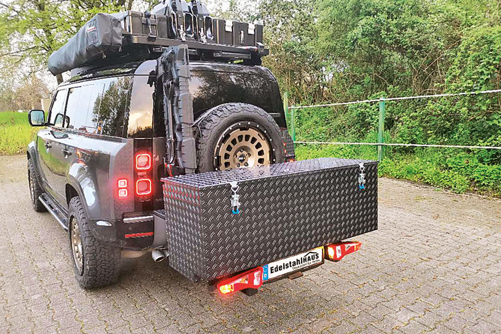 Wer wünscht, lässt beispielsweise die Aluminiumstaukästen in Schwarz pulverbeschichten – wie auf den Bildern die Kisten für Land Rover Defender auf der Anhängerkupplung oder die Staukästen für den Mercedes Sprinter fürs Dach oder Heckträger. www.edelstahlhaus.de