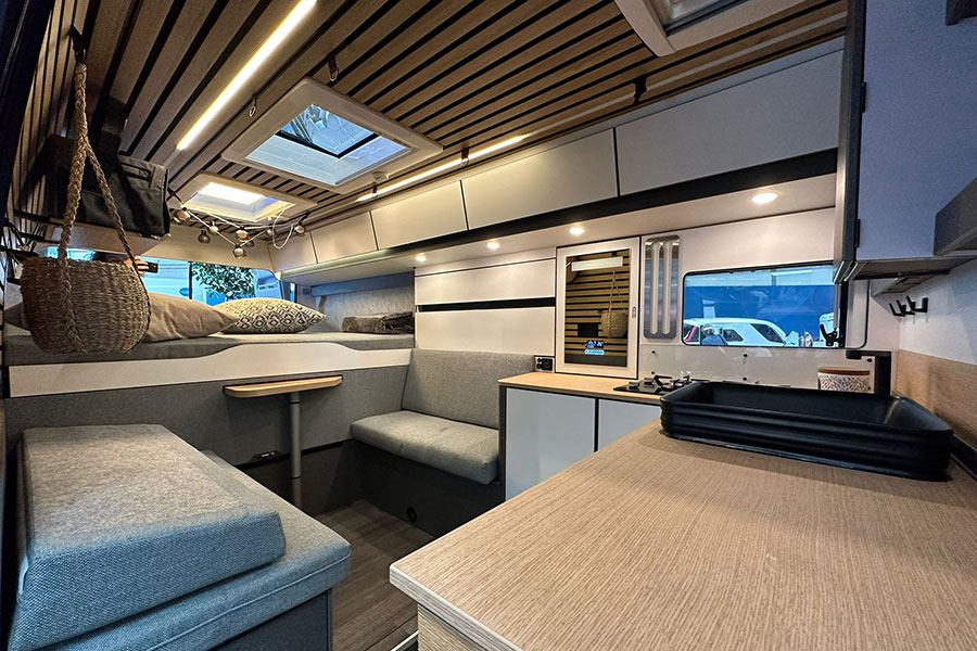 Clou ist die flexible Duschkabine, die sich im Podest der Sitzgruppe versteckt. Das Gesamtkonzept nennt Weinsberg „Vanlife von den Profis“. Ab 59.990 Euro. Halle 1 und Halle 4.