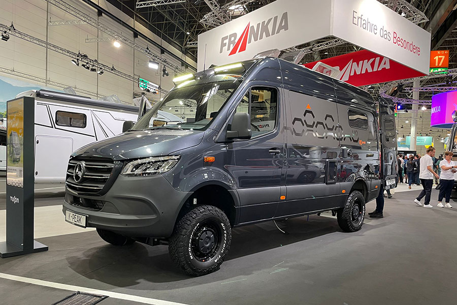 Aus dem K-Peak-Modell von Frankia Yucon wird eine gesamte Baureihe. Hinzu kommen zwei Grundrisse, beide mit Längsbetten, auf sechs oder knapp sieben Meter langem Sprinter 4×4. Dabei bleibt die Aufteilung gegenüber der Standard-Yucons unverändert. Vielmehr handelt es sich bei den K-Peak-Modellen um absolut vollausgestattete Allrad-Campervans. 190 PS, Neungangautomatik, Schlechtwegefahrwerk, AT-Bereifung, sämtliche Assistenzsysteme sowie 300 Ah Lithium und Solar sind ab Werk verbaut. Grundpreis: 112.500 Euro.