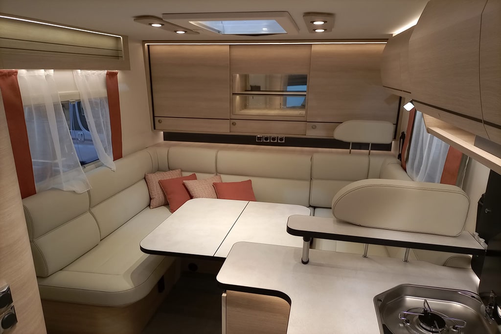Der 6,98 Meter lange Rapido 854F ist zusätzlich zur umbaubaren Rundsitzgruppe mit einem Hubbett vorm Bad über den drehbaren Vordersitzen ausgestattet. An der Rundsitzgruppe lassen sich ein Sitzplatz in und ein Sitzplatz entgegen der Fahrtrichtung bauen. Somit ist der Rapido 854F für vier Reisende ausgelegt. Grundpreis: 89.000 Euro.