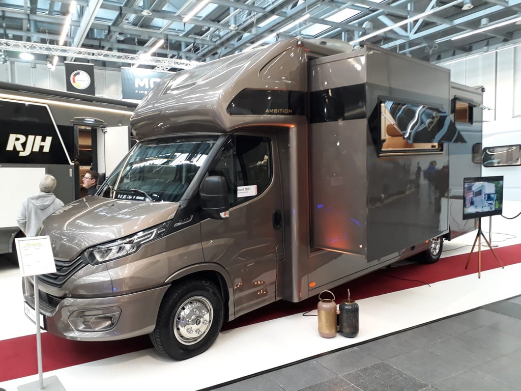 Ein Luxus-Alkoven mit IVECO Daily 72-210 Hi-Matic Fahrgestell zeigt RJH Reisemobile. Der knapp über 8 Meter lange und 3,4 Meter hohe Ambition bleibt unter 7,5 Tonnen und ist für vier Personen ausgelegt (4-5 Schlafplätze inklusive Alkoven).