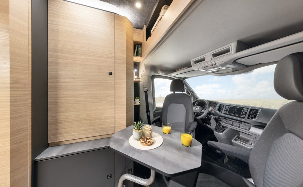 Im vorderen Fahrzeugbereich entsteht eine Sitzgruppe für zwei Personen durchs Drehen der Fahrerhaussitze. Hier gibt es außerdem einen geräumigen Schrank. Er ist beleuchtet und kann wahlweise mit einer Kleiderstange oder zwei Einlegeböden genutzt werden. Der drehbare Säulenschwenktisch ist immer dort zur Stelle, wo er gerade gebraucht wird. Ob vorne im Fahrerhaus oder im Heck zwischen den Sitzbänken. Wird der Tisch mal nicht gebraucht, lässt er sich einfach im serienmäßigen Doppelboden verstauen.