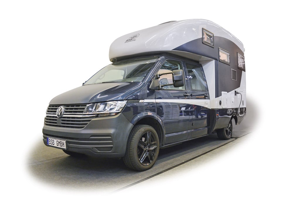 Die BSB Sonderfahrzeuge GmbH aus Reutlingen nahe Stuttgart setzt die äußerst solide und kältebrückenfreie GfK-Monocoque-Wohnkabine des Modells Akkedis, die aus einem Stück gefertigt wird, fest auf den VW T6.1-Doppelkabiner mit werkseitig 150 PS Leistung. Darin verbaut BSB eine Gegensitzgruppe im Heck, Längsküche und Bad mit Klappwaschbecken und GfK-Wänden in Wagenmitte sowie ein 206 mal 180 Zentimeter großes Bett im 90 Zentimeter hohen Alkoven. Zur umfangreichen Serienausstattung gehören unter anderem eine Solaranlage, Diesel-Standheizung und eine Lithium-Aufbaubatterie 200 Ah.