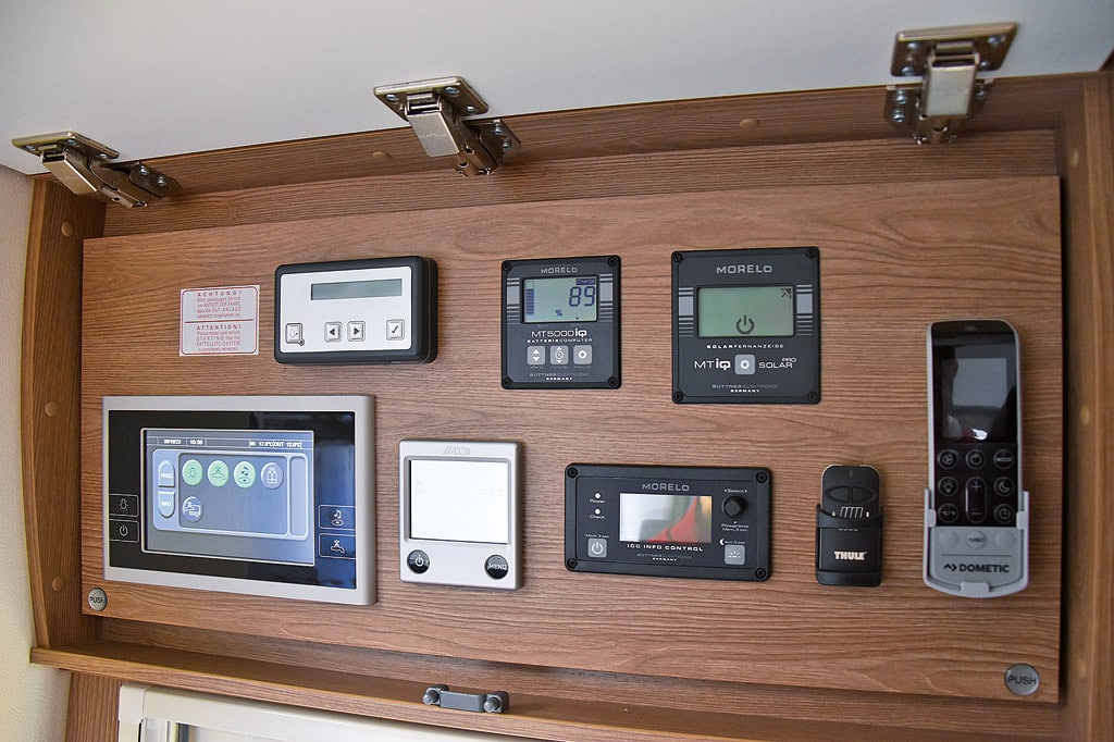 Alles im Blick: Steuereinheiten und Kontroll-Panels für Heizung, Akkus und Co. sind über der Aufbautür hinter einer Möbelklappe untergebracht.