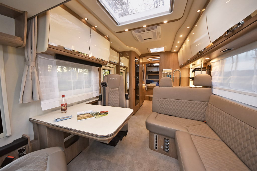 Palast auf Rädern: Das Raumangebot im Morelo Palace ist erwartungsgemäß üppig. Bar-Sitzgruppe mit drehbarem Schwingsitz und L-Bank. Zahlreiche LED-Spots und -leisten beleuchten das Ensemble stimmungsvoll.