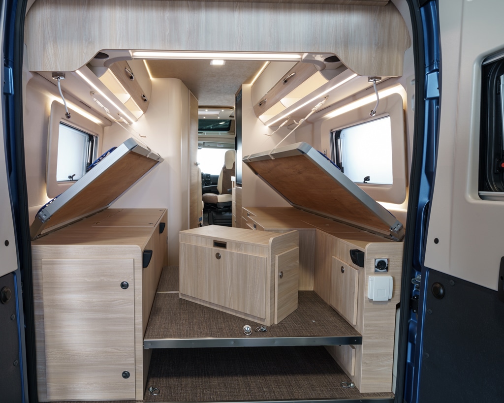 Viel Wert legt Eura Mobil auch auf gut nutzbare Stauräume. Im Heck lassen sich Möbelmodule herausnehmen und der Stauraum unter dem Bett mit einem praktischen Zwischenboden unterteilen. Und wie bei den aufgebauten Reisemobilen achtet Eura Mobil auch bei seinen neuen Kastenwagen auf bestmögliche Wintertauglichkeit. Isolierung und Heizung erreichen den Winterfestigkeitsstandard EN 1646, der unter anderem sicher stellt, daß sich ein bei minus 15 Grad Celsius ausgekühltes Fahrzeug innerhalb des vorgegebenen Zeitfensters von 2 Stunden auf plus 20 Grad Celsius im Innenraum erwärmt.