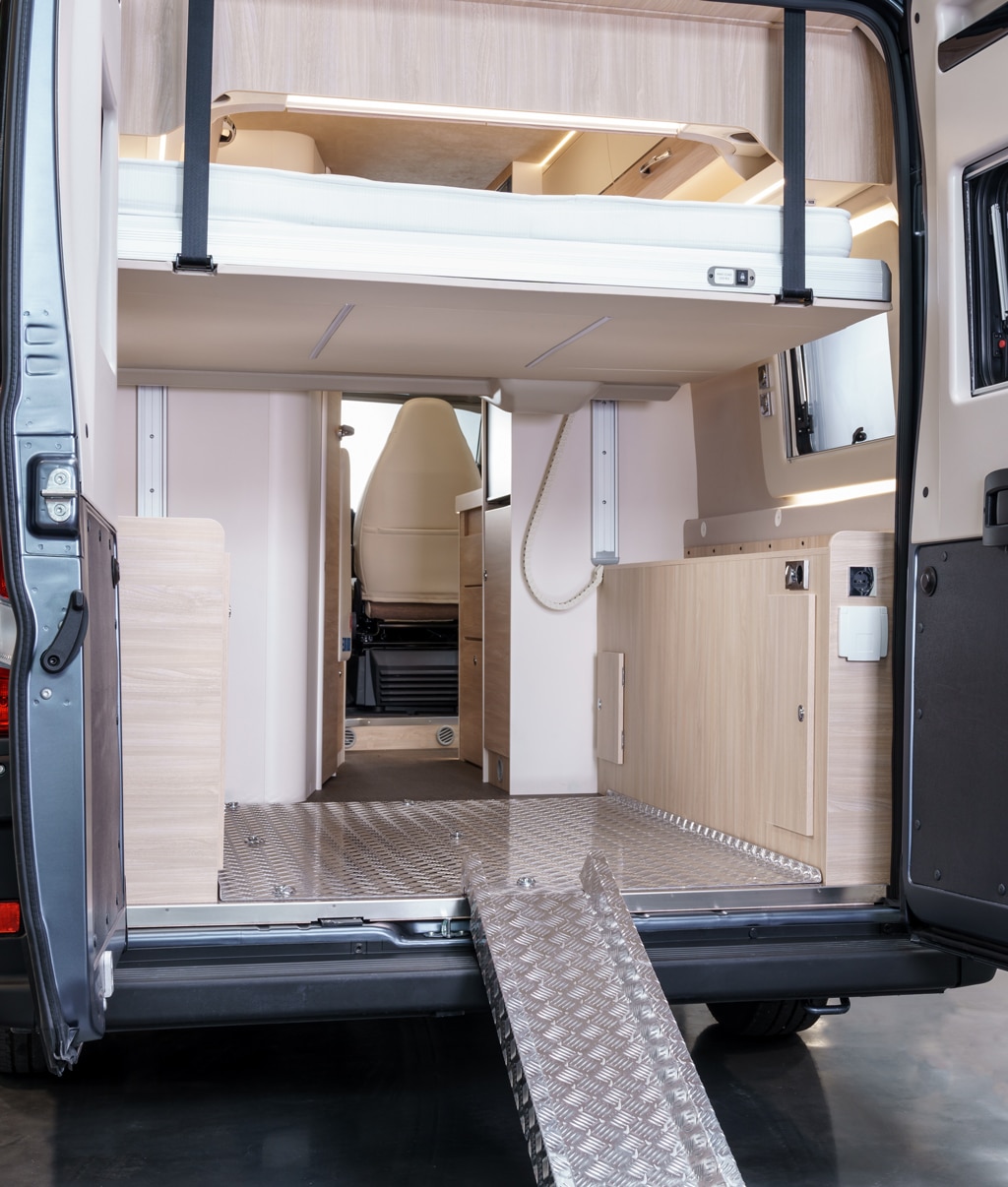 Blick ins Heck des Eura Mobil V 635 HB: Das Hubbett fährt elektrisch auf und ab und ermöglicht in der breiten Garage zum Beispiel den Transport von Motorrädern. Eine Rampe hilft beim Einladen, der solide Riffelblech-Boden zeigt sich unempfindlich auch bei größerer Beanspruchung. Weil die Gurte des Heckbetts vorn und hinten angebracht sind, ist die Liegefläche über die gesamte Fahrzeugbreite nutzbar. Die Länge fällt aber auch nicht üppiger aus als bei den anderen Grundrissen: Eura Mobil gibt 1,90/1,75 Meter an.
