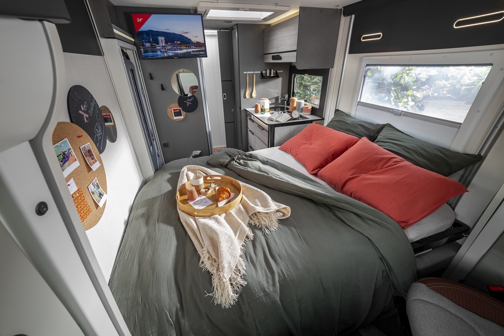 Über der Sitzgruppe lässt sich ein Hubbett für zwei Urlauber elektrisch absenken. Aus der Sitzgruppe entsteht bei Bedarf ein weiteres Doppelbett, so dass auch vier Camper im X150 übernachten können. Beide Liegeflächen messen 190 mal 140 Zentimeter. Aus den Längssofas enstehen mit wenigen Handgriffen zwei Sitzplätze mit Dreipunktgurt in Fahrtrichtung.