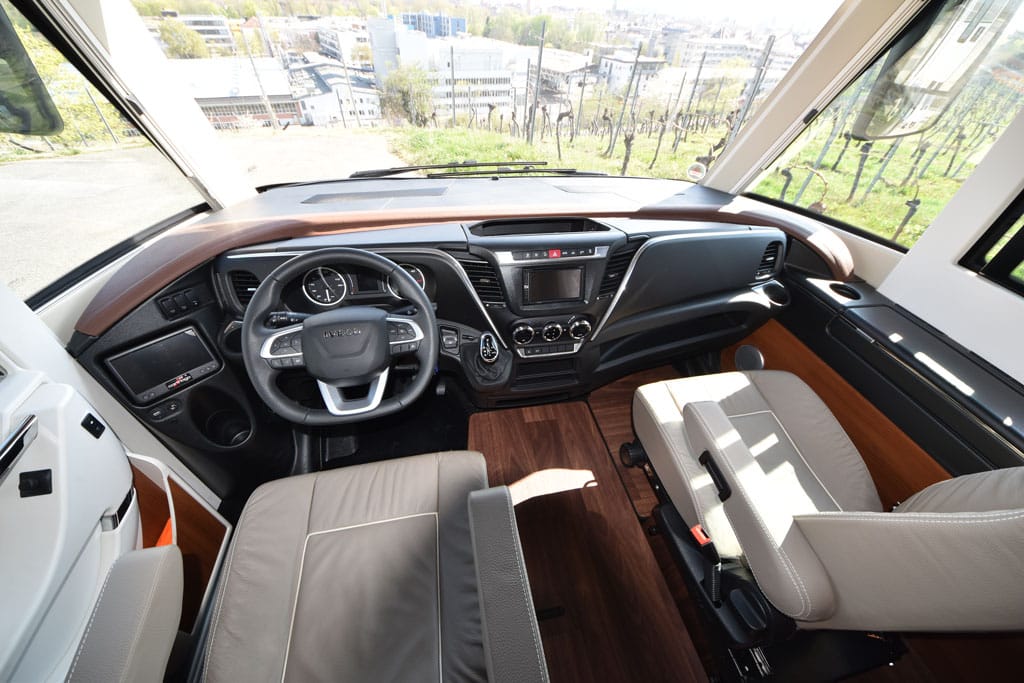 Modern und großzügig dimensioniert: Das Carthago-Fahrerhaus und das Iveco-Cockpit sind komfortabel. Aguti-Sitze mit jeweils zwei Armlehnen erhöhen den Fahrkomfort. Dazu passt gut das mit Leder bezogene Armaturenbrett. Letzteres senkt Carthago weit nach vorne zur Panorama-Windschutzscheibe hin ab. Deshalb sieht der Fahrer bereits ab 2,77 Meter die Fahrbahn.