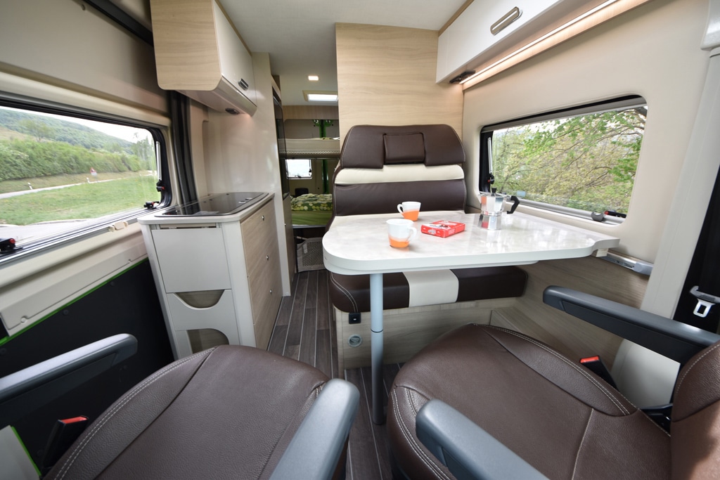 Die Aufteilung des Innenraums entspricht mit Küchenblock an der Schiebetür, Bad gegenüber und Halbdinette mit drehbaren Vordersitzen im Bug dem Klassenstandard. Die zwei Doppelbetten übereinander im Heck sind eine Besonderheit. Sind tatsächlich vier Camper im Forster unterwegs, wird aber der Stauraum knapp.