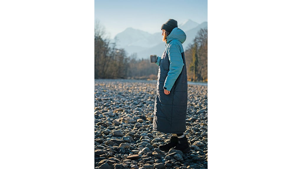 Am Abend wird das Fußteil einfach wieder ausgeklappt und so in einen Schlafsack umfunktioniert – im Handumdrehen und ohne die wärmende Hülle zu verlassen. Die vegane Wärme-Isolierung PrimaLoft RISE besteht zu mindestens 80 Prozent aus recycelten Materialien. Das Repreve-Material der Außenhaut ist soft, dennoch strapazierfähig und wird aus recycelten Plastikflaschen hergestellt.